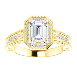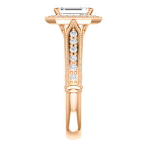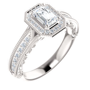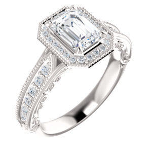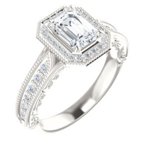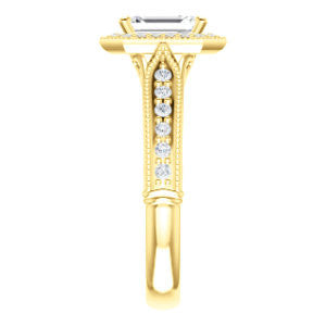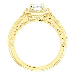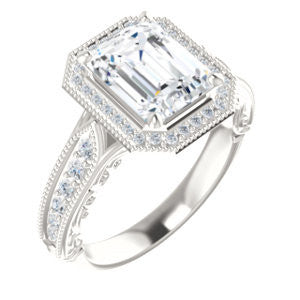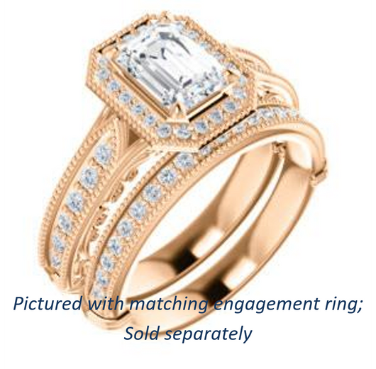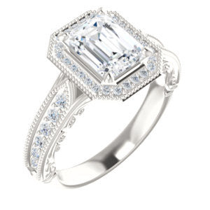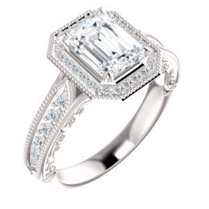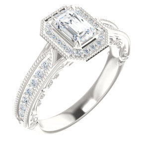 The Zöe engagement ring features a prong-set Radiant Cut cubic zirconia center stone from 0.33 to 2.50 carats. Her center setting is enhanced by a cathedral-raised halo design of sixteen (16)* small round-cut accent stones circling the diamond-quality center stone like a ring of fiery brilliance around the top of Mount Olympus. Beneath that center setting is a breathtakingly-intricate engraved trellis further accented by twin peekaboo side stones that together make this design “three-sided”. Fourteen (14)* round-cut accent stones sized 1.40-1.50 mm* march along the milgrain-and-filigree decorated band, offering a glimpse of something divine. The Zöe was created to be more than just a ring. This is the catalyst of a transcendental experience. It’s not easy becoming a modern Greek goddess, but it can be simple. Get The Zöe engagement ring as a stand-alone or together with the matching anniversary band to complete the cubic zirconia bridal set!
