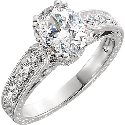 Antiquely crafted, polished, durable and yours for all time in your choice of pure precious metals featuring thirty (30)* round accent stones, this is an intriguing piece of wearable art we can hardly wait to manufacture just as soon as you click and let us know you're interested. A hand-set style including dual peekaboo stones beneath and to both sides of the 1.00 carat 5A oval cut cubic zirconia center stone, accented by a beautiful pavé -style band with delicate milgrained and filigree edges ought to prove the skill of our experienced jewelry-making team. The light dances over The ________'s sparkling, solid hand-engraved band and her 1.0 carat oval-cut  5A diamond-quality CZ gemstone that declares her promise of love loudly to the world! The ________ design is eligible for our Naming Rights program with discount. What shall we name her?