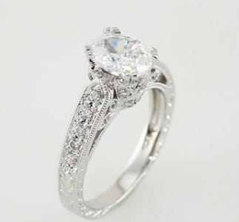 The Pear Cut – also known as teardrop cut, this is a brilliant-cut stone with respect to facets. Pear cut is a less-popular choices for center stones; they are, however, commonly used as accent stones in all manner of rings, engagement rings and other fine jewelry pieces (a center stone of your choice flanked by two equally-sized pear cut accents, one to either side, is a common three-stone configuration). Similar to the heart cut or marquise cut stone, preference for the pear cut is mainly because of its unique shape rather than brilliance. However, this pointed-tip shape has many design pitfalls jewelers have to look out for when working with it. Care should also be taken when wearing jewelry with pear cut stones because the stone has a pointed tip that can be prone to chipping and breakage. The pear cut is elongated, with non-equal length and width.